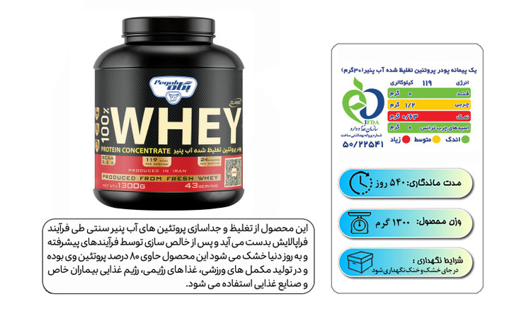 پروتئین وی 100% پگاه خراسان 1500گرمی پروتئین وی پگاه خراسان که در وزن 1500گرمی تولید شده است، برای مصرف ورزشکاران حرفهای که تشنه دریافت انواع مکملهای پروتئین وی زود جذب هستند بسیار توصیه می شود. متاسفانه در سالهای اخیر به علت افزایش قیمت دلار و فراوان شدن مکمل های تقلبی ، نظر ورزشکاران نسبت به مکمل های ایرانی از جمله پگاه خراسان جلب شده است. در این محصول کنسانتره پروتئین وی (wpc) از آب پنیر آنزیمی یا آب پنیر سنتی استخراخ و تولید می شود. به همین جهت خلوص بالا و عدم استفاده از هیچ افزودنی اضافی، به کیفیت این محصول پگاه خراسان افزوده است. پگاه محصول پروتئین وی 100 درصد را در وزن 10کیلوگرمی نیز تولید کرده که به آسانی حمل میشود. همچنین محصول 1250 گرمی برای تست نیز میتواند استفاده شود. پروتئین صد درصد وی به این معنی است که در ساخت پروتئین وی ، از پروتئین کازئین استفاده نشده است و همه ی حجم پروتئین استفاده شده از نوع وی است. پروتئین کازئین نوعی دیگری از پروتئین است که در شیر یافت می شود. برای تولید پروتئین 100 درصد وی هیچ مقداری از پروتئین کازئین در تولید محصول استفاده نمی شود. مزایای مصرف پروتئین وی 100 درصد پگاه پروتئین وی پگاه در هر دوره خشک کردن (کات) و در دوره حجم (بالک) مصرف می شود. به دلیل اینکه پروتئین وی باعث عضله سازی سریع می شود در نتیجه باعث افزایش حجم عضلات می شود از این رو در هر دو دوره قابل مصرف است. مزایای پروتئین وی 100 درصد پگاه به شرح زیر است: افزایش عضله سازی کاهش اشتها کمک به چربی سوزی در دوره خشک کمک به افزایش حجم در دوره افزایش حجم افزایش سوخت و ساز بدن افزایش راندمان و انرژی برای ورزشکارانی که قصد مصرف مقدار بیشتری پروتئین در دوره های ورزشی خود دارند پروتئین وی 10 کیلویی پگاه بسیار مرقون به صرفه تر است. از طرفی اگر طعم برای شما اهمیت کمتری از درصد پروتئین داشته باشد ، خلوص پروتئین پگاه به علت اینکه هیچ ماده افزودنی در آن استفاده نشده اندکی بالاتر است و درصد پروتئین ذکر شده واقعی تر است.حلالیت و جذب شوندگی وی پگاه مطلوب و قابل رضایت است نحوه مصرف مقدار 30 تا 40 گرم از پروتئین وی پگاه را با 250 میلی لیتر آب داخل شیکر اضافه کنید و به خوبی شیکر را تکادهید تا املاح کامل حل شوند.